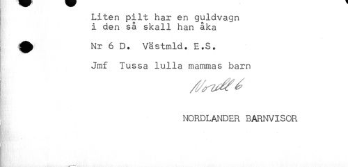 //// ! Liten pilt har en guldvagn //// i den så skall han åka //// . A Nr 6 D. Västmld. E.S. //// Jmf Tussa lulla mammas barn //// NORDLANDER BARNVISOR ////