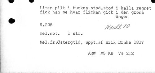//// Liten pilt i busken stod,stod i kalla regnet //// fick han se hvar flickan gick i den gröna //// ängen //// S.238 //// mel.not. 1 str. //// Mel.fr.Östergtld, uppt.af Erik Drake 1817 //// ARW MS KB Vs 2:2 ////