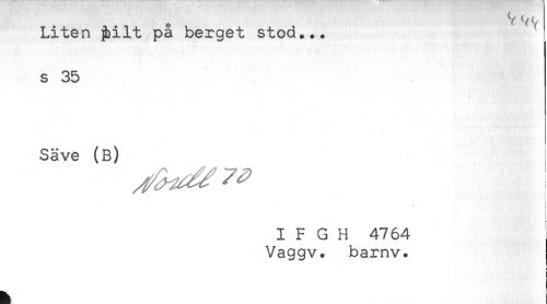 //// Y ^ //// Liten ^ilt pa berget stod... //// s 35 //// Säve (B) //// I F G H 4764 //// Vaggv. barnv. //// I //// ^ ! ////