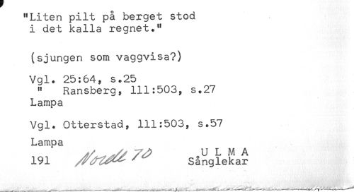 //// "Liten pilt på berget stod //// i det kalla regnet." //// (sjungen som vaggvisa?) //// Vgl. 25:64, s*25 //// " Ransberg, 111:503, s.27 //// Lampa //// Vgl. Otterstad, 111:503, s.57 //// Lampa //// 191 ^^ Sånglekar ////