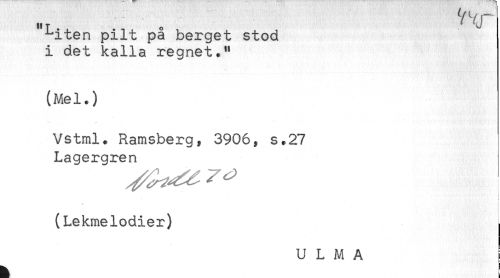 //// HT . ' XJ //// ^iten pilt på berget stod //// i det kalla regnet." //// (Mel.) //// Vstml. Ramsberg, 3906, s.27 //// Lagergren //// (Lekmelodier) //// U L M A i ////