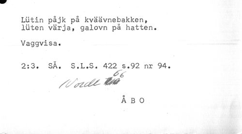 //// Lutin påjk på kväävnebakken, //// luten värja, galovn på hatten. //// Vaggvisa. //// 2:3. SÅ. S.L.S. 422 s.92 nr 94. //// ÅBO ////