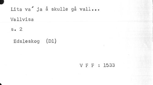 //// : //// Lita va"* ja å skulle gå vall... //// Vallvisa //// i //// s. 2 //// j //// Edsleskog (Dl) //// * //// V F F : 1533 ////