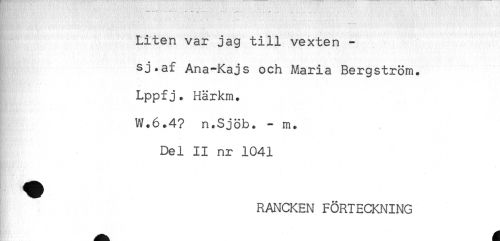 //// * - - . . - ..... //// Liten var jag till vexten - //// sj.af Ana-Kajs och Maria Bergström. //// Lppfj. Härkm. //// W.6.4? n.Sjöb. - m. //// Del II nr 1041 //// RANCKEN FÖRTECKNING //// < ////