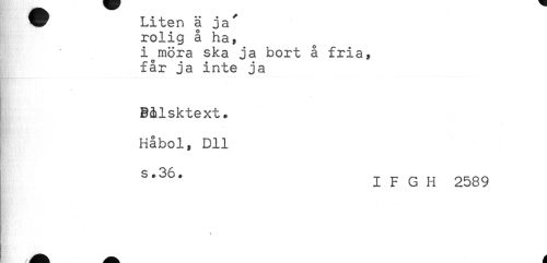 //// W Liten ä ja' //// rolig å ha, //// i möra ska ja bort å fria, //// får ja inte ja //// B&lsktext. //// Håbol, Dll //// I F G H 2589 ////