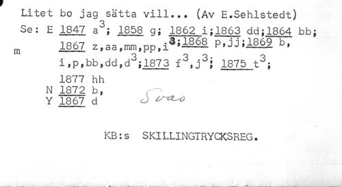 //// Litet bo jag satta vill... (Av E.Sehlstedt) //// Se: E 1847 a^; 1858 g; 1862 i;1863 dd;1864 bb; //// 1867 z,aa,mm,pp,1^^868 p,jj;1869 b, //// i,p,bb,dd,d^;1873 1875 t^; //// 1877 hh //// N 1872 b, //// Y 1867 d ^ //// KB:s SKILLINGTRYCKSREG. ////