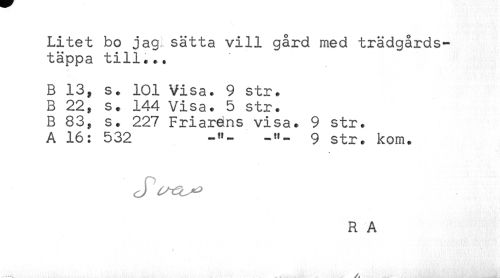 //// Litet bo jag sätta vill gård med trädgårds- //// täppa till... //// B 13, s. 101 Visa. 9 str. //// B 22, s. 144 Visa. 5 str. //// B 83, s. 227 Friarens visa. 9 str. //// A 16: 532 -"- -"- 9 str. kom. //// J ^^ //// R A ////