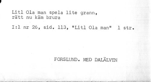 //// Litl Ola man spela lite grann, //// rätt nu käm brura //// 1:1 nr 26, sid. 113, "Litl Ola man" 1 str. //// FORSLUND. MED DALÄLVEN ////