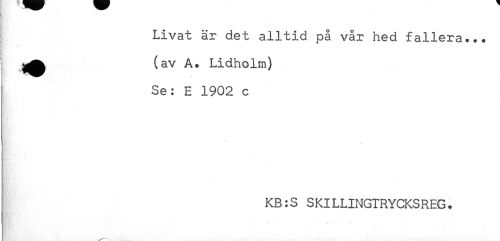 //// ) //// t //// i Livat är det alltid på vår hed fallera... //// 3 - //// i //// i //// (av A. Lidholm) //// Se: E 1902 c //// . //// KB:S SKILLINGTRYCKSREG. ////