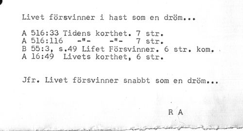 //// Livet försvinner i hast som en dröm... //// A 516:33 Tidens korthet. 7 str. //// A 516:116 -"- -"- 7 str. //// B 55:3, s.49 Lifet Försvinner. 6 str. kom. ^ //// A 16:49 Livets korthet, 6 str. //// Jfr. Livet försvinner snabbt som en dröm... //// * //// R A ////
