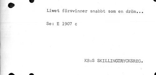 //// Livet försvinner snabbt som en dröm... //// Se: E 1907 c //// * //// * //// * //// . //// KB:S SKILLINGIRYCKSREG. //// * * ////