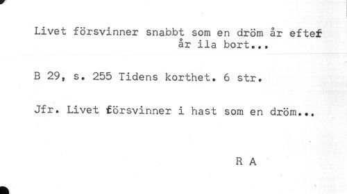 //// Livet försvinner snabbt som en dröm år eftef //// år ila bort..* //// B 29, s. 255 lidens korthet. 6 str. //// Jfr. Livet försvinner i hast som en dröm... ////