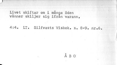 //// t //// { //// 'W' //// Livet skiftar om i många öden //// vänner skiljer sig ifrån varann, //// 4:4. LT. Silfvasts Visbok, s. 8-9. nr.6. //// ] //// in ////