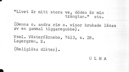 //// "Livet är mitt stora ve, döden är min //// trängtan." etc. //// (Denna o. andra rim o. visor brukade läsas //// av en gammal tiggaregubbe). //// Vsml. Västerfärnebo, 7613, s. 28. //// Lagergren, E. //// (Religiösa dikter). //// U L M A ////