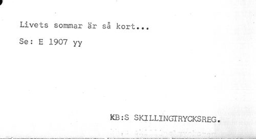 //// Livets sommar är så kort... //// Se: E 1907 yy //// * //// KB:S SKILLINGTRYCKSREG. //// ' * . .. ^ ' - ^ - - ////