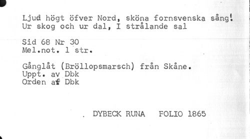 //// Ljud högt öfver Nord, sköna fornsvenska sångt //// Ur skog och ur dal, I strålande sal I //// < //// < //// < //// Sid 68 Nr 30 i //// Mel.not. 1 str. ! //// j //// : //// Gånglåt (Bröllopsmarsch) från Skåne. ; //// Uppt. av Dbk ' //// Orden af Dbk ^ //// i //// . DYBECK RUNA FOLIO 1865 ////