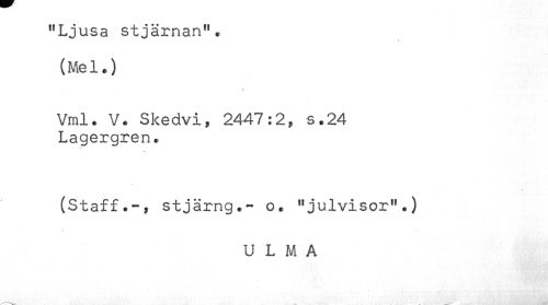 //// "Ljusa stjärnan". //// * //// (Mel.) //// Vml. V. Skedvi, 2447:2, s.24 //// Lagergren. //// (Staff.-, stjärng.- o. "julvisor".) //// U L M A ////
