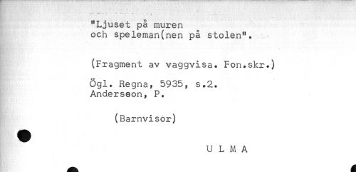 //// "Ljuset på muren //// och speleman(nen på stolen". //// (Fragment av vaggvisa. Fon.skr.) //// . //// Ögl. Regna, 5935, s.2. //// Andersson, P. //// (Barnvisor) //// ^ U L M A ////