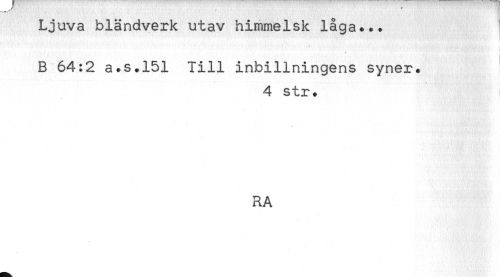 //// Ljuva bländverk utav himmelsk låga... //// t //// B 64:2 a.s.151 Till inbillningens syner. //// 4 str. i //// RA ////