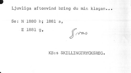 //// Ljuvliga aftonvind bring du min klagan... //// Se: N 1880 b; 1881 a, //// E 1881 g, //// Jj rt^-o //// KB:s SKILLINGTRYCKSREG. ////