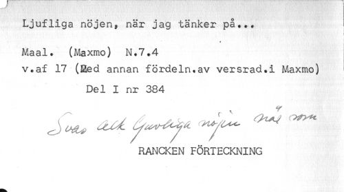 //// Ljufliga nöjen, när jag tänker på... //// * //// Maal. (Maxmo) N.7.4 //// v.af 17 (Eed annan fördeln.av versrad.! Maxmo) //// Del I nr 384 //// RANCKEN FÖRTECKNING ////