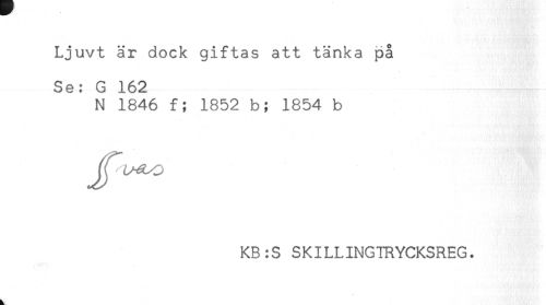 //// Ljuvt är dock giftas att tänka på //// Se: G 162 //// N 1846 f; 1852 b; 1854 b //// KB:S SKILLINGTRYCKSREG. ////