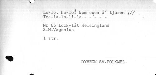 //// Lo-lo, ho-lo! kom oxen å' tjuren ; //// //Tra-la-la-li-la ----- //// - //// t //// Nr 65 Lock-låt Helsingland //// S.H.Vagenius //// 1 str. //// < //// ^^ DYBECK SV.FOLKMEL. ////