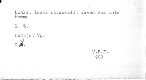 //// T //// Lonka, lonka rävaskall, räven var inte //// hemma //// S. 5. //// Hemsjö, Vg. //// D //// V.F.F. //// 903 ////