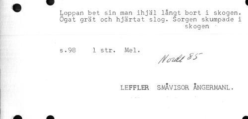 //// ^ Loppan bet sin man ihjäl långt bort i skogen. //// Ögat grät och hjärtat slog. Sorgen skumpade i //// skogen * //// s.98 1 str. Mel. //// LEFFLER SMAVISOR ÅNGERMANL. ////
