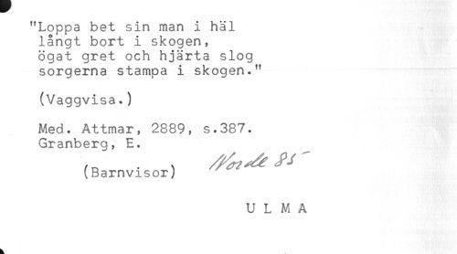 //// "Loppa bet sin man i häl //// långt bort i skogen, //// ögat gret och hjärta slog //// sorgerna stampa i skogen." //// (Vaggvisa.) //// Med. Attmar, 2889, s.387. //// Granberg, E. //// (Barnvisor) //// U L M A ////