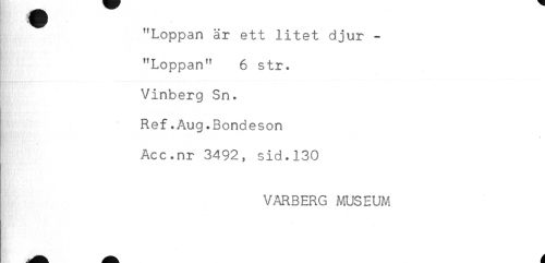 //// "Loppan är ett litet djur - //// "Loppan" 6 str. //// Vinberg Sn. //// Ref.Aug.Bondeson //// Acc.nr 3492, sid.130 //// VARBERG MUSEUM ////