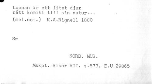 //// Loppan är ett litet djur //// rätt komikt till sin natur... //// (mel.not.) K.A.Rignell 1880 //// Sm //// NORD. ms. //// Mskpt. Visor VII. s.573, E.U.29865 ////