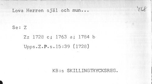 //// Lova Herren själ och mun... //// Se: Z //// < //// Zz 1728 c; 1763 a; 1784 b //// Upps.Z.P.s.15:39 (1728) //// KB:s SKILLINGTRYCKSREG. //// ä I ////