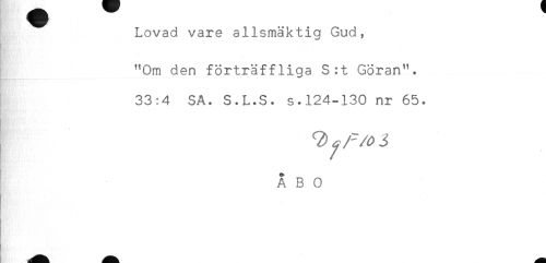 //// Lovad vare allsmäktig Gud, //// "Om den förträffliga S:t Göran". //// 33:4 SA. S.L.S. s.124-130 nr 65. //// ÅBO //// M j! . ////