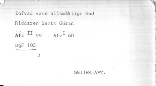 //// Lofvad vare allsmäktige Gud //// Riddaren Sankt Göran //// Afz 'II 99 Afz^ 60 //// r //// DgF 103 //// i //// \ //// GEIJER-AFZ. ////
