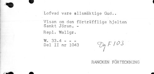 //// Lofvad vare allsmäktige Gud.. //// t //// Visan om den förträfflige hjelten //// Sankt Jöran, - //// Repl. Wallgr. //// W. 33.4------^ 7 //// /Del II nr 1043 / ^ J //// RANCKEN FÖRTECKNING //// * ////