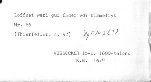 //// Loffuat wari gud fader vdi himmelryk //// '^W"'^'-' a) //// Nr. 66 //// (Thierfelder, s. 97) //// / f //// VISBOCKER 15-o. 1600-talens //// K.B. 16:° ////