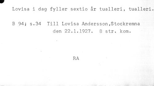 //// Lovisa i dag fyller sextio år tualleri, tualleri. //// B 94; s.34 Till Lovisa Andersson,Stockremna //// den 22.1.1927. 8 str. kom. //// t //// RA //// t . ////