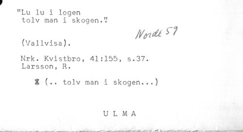 //// "Lu lu i logen //// tolv man i skogen.V //// (Vallvisa). //// Nrk. Kvistbro, 41:155, s.37. //// Larsson, R. //// $ (.. tolv man i skogen...) //// U L M A ////