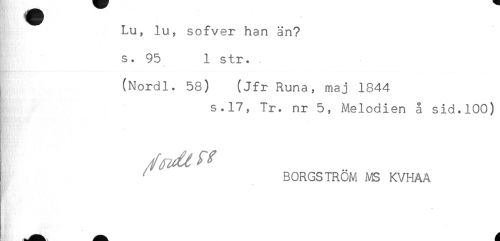 //// Lu, lu, sofver han än? //// s. 95 1 str. //// (Nordl. 58) (Jfr Runa, maj 1844 //// s.17, Tr. nr 5, Melodien å sid.100) //// E/ '* //// ' BORGSTRÖM MS KVHAA ////