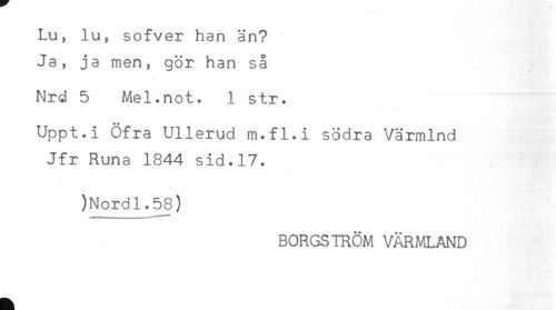 //// Lu, lu, sofver han än? //// Ja, ja men, gör han så //// Nrd 5 Mel.not. 1 str. //// Uppt.i Öfra Ullerud m.fl.i södra Värmlnd //// Jfr Runa 1844 sid.17. //// )Nordl.J58) //// BORGSTRÖM VÄRMLAND ////