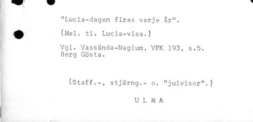 //// f'' . \ //// "Lucia-dagen firas varje år". //// (Mel. ti. Lucia-visa.) //// i Vgl. Vassända-Naglum, VFK 193, s.5. //// ! Berg Gösta. //// < //// ij //// (Staff.-, stjärng.- o. "julvisor".) //// f //// U L M A //// B,','.,.: ^ * ' . ////