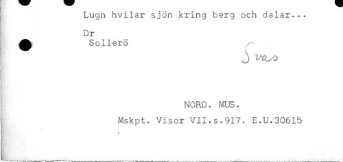//// Lugn hvilar sjön kring berg och dalar... //// Dr //// ^t) Sollerö //// t ^X) //// NORD. MUS. //// I Mskpt. Visor VII.s.917. E.U.30615 ////