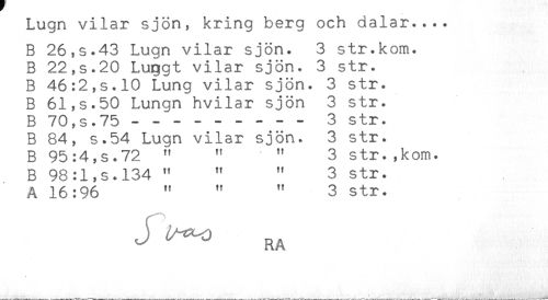 //// Lugn vilar sjön, kring berg och dalar.... //// B 26,s.43 Lugn vilar sjön. 3 str.kom. //// B 22,s.20 Luqgt vilar sjön. 3 str. //// B 46:2,s.10 Lung vilar sjön. 3 str. //// B 61,s.50 Lungn hvilar sjön 3 str. //// B 70,s.75 ---- 3 str. //// B 84, s.54 Lugn vilar sjön. 3 str. //// B 95:4,s.72 " " " 3 str.,kom. //// B 98:l,s.l34 " " " 3 str. //// A 16:96 " " " 3 str. //// ^ ^ RA ////