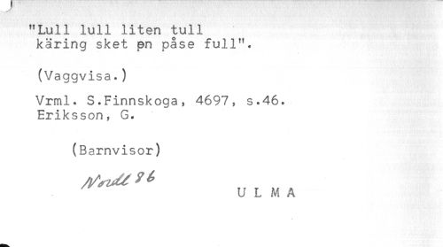 //// "Lull lull liten tull //// käring sket pn påse full^. //// (Vaggvisa.) //// Vrml. S.Finnskoga, 4697, s.46. //// Eriksson, G. //// (Barnvisor) //// U L M A ////