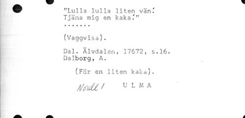 //// "Lulla-lulla liten vänf //// Tjäna mig en kakaf" //// (Vaggvisa). //// Dal. Älvdalen, 17672, s.16. //// Dalborg, A. //// (För en liten kaka). //// ^ L M A ////