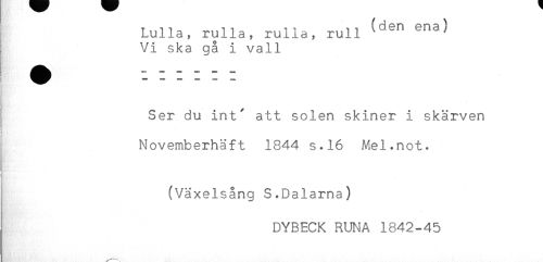 //// ] Lulla, rulla, rulla, rull ^^ ^^ //// Vi ska gå i vall //// Ser du int^ att solen skiner i skärven //// < //// Novemberhäft 1844 s.16 A^el.not. //// t //// (Växelsång S.Dalarna) //// DYBECK RUNA 1842-45 ////