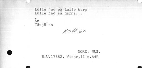 //// Lulle jag på Lulle berg //// Lulie jag så gärna... //// - - //// T* O # # //// Tasjo sn //// ^ NORD. MUS. //// E.U.17882. Visor,II s.645 ////