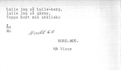 //// Lulle jag på Lulle-berg, //// lulle jag så gärna, ! //// Tappa bort min skälleko //// An //// NORD.MUS. //// HA Visor ////