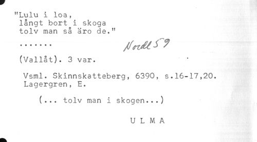 //// "Lulu i loa, //// långt bort i skoga //// tolv man så äro de." //// (Vallat). 3 var. //// Vsml. Skinnskatteberg, 6390, s.16-17,20. //// Lagergren, E. //// (... tolv man i skogen...) //// U L M A ////